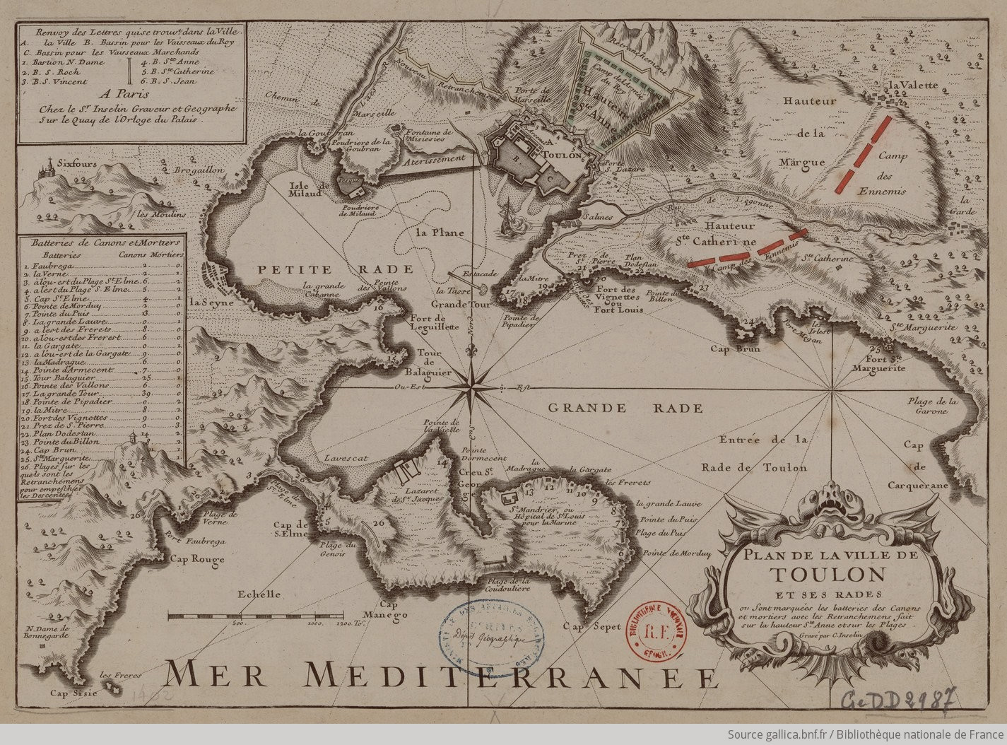 Plan de la ville de Toulon et ses rades ou sont marqués les batteries des canons et mortiers avec les retranchements fait sur la hauteur St Anne et sur les plage (Charles Inselin, XVIIIe)